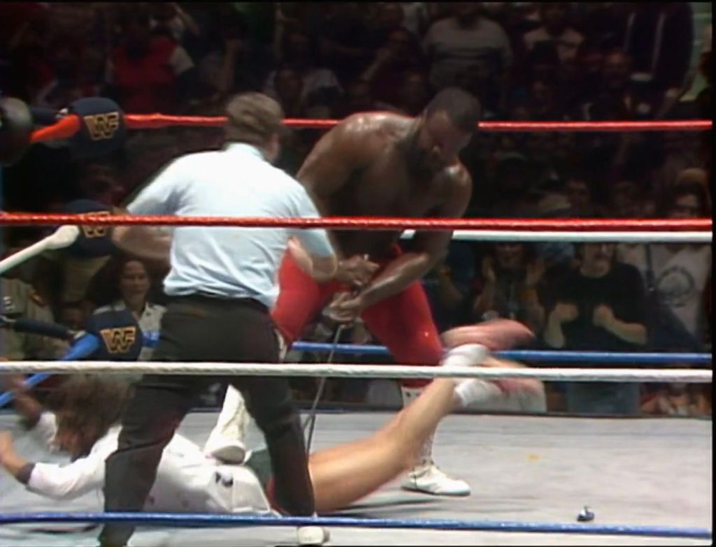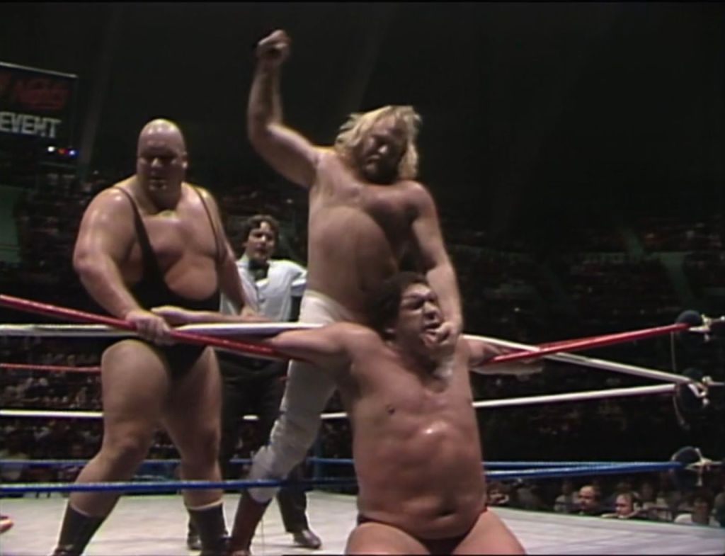 Ma per quanta potenza di fuoco potessero vantare Hogan e André, Bundy e Studd potevano sempre contare su una cattiveria senza eguali: a loro non importava vincere, ma fare più del male che potessero. Ne fece le spese André, che si ritrovò con le braccia incastrate tra le corde, praticamente alla mercé dei due, con Studd che picchiò sullo sterno che il francese si era rotto il mese prima a suon di pugni, potenti come un martello pneumatico. L’arbitro chiamò la squalifica, e ad evitare che Studd fracassasse nuovamente lo sterno di André ci pensò Hogan, sempre pronto ad aiutare l’amico nel momento del bisogno.