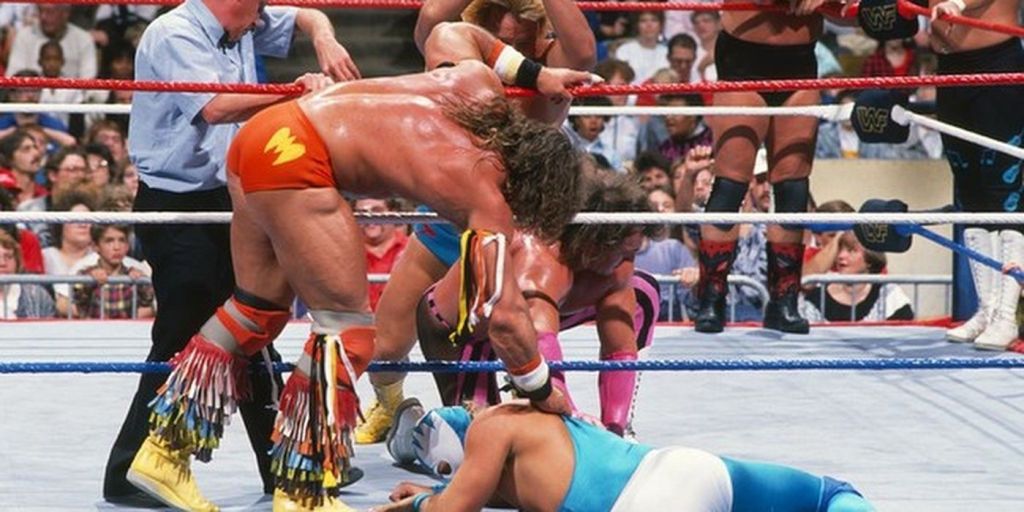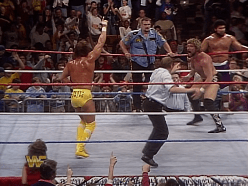 A quel punto la strategia dei tre divenne piuttosto semplice: fare a pezzi i Mega Powers con ogni mezzo necessario, a costo di farsi buttare fuori dall’arbitro, così da lasciarli inermi per un facile schienamento finale di Haku. I Twin Towers replicarono quanto fatto pochi giorni prima al Brother Love Show: ammanettare Hogan e fare tutto il resto col suo manganello di Big Boss Man. Appena ci riuscirono l’arbitro buttò fuori sia Big Boss Man che Akeem (il primo per count out, il secondo per squalifica), lasciando però sia Savage che Hogan in condizioni precarie, e ad Haku la strada spianata per la vittoria. Ma Slick e soci continuavano a sottovalutare l’importanza di Miss Elizabeth, il vero cuore dei Mega Powers, che riuscì a rubare da Slick (messo KO da Hogan) le chiavi delle manette che tenevano imprigionato l’Hulkster. Appena libero, Hogan riuscì a dare il cambio a Savage, riversando tutta la sua furia su King Haku, fino al Leg Drop finale che valse la vittoria del suo team!
