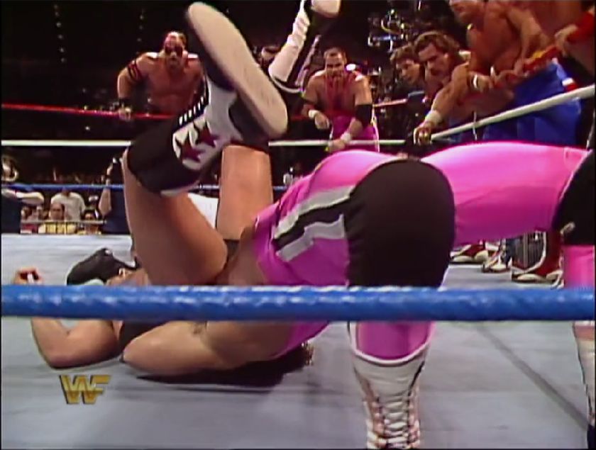 A impressionare particolarmente furono i Rockers, che nonostante la poca esperienza in WWF si dimostrarono perfettamente all’altezza, eliminando i Bolsheviks (che però erano riusciti a buttare fuori gli Young Stallions). Marty Jannetty & Shawn Michaels non arrivarono fino alla fine del match, ma non furono neanche schienati: a buttarli fuori l’arbitro Earl Hebner, che dopo una rissa incontrollata tra i due e i Brain Busters (che neanche l’intervento dell’arbitro Tim White era riuscito a sedare) decretò per entrambe le coppie una doppia squalifica. Dopo l’eliminazione dei British Bulldogs rimanevano solo i Powers of Pain da una parte, e Conquistadoros e Demolition dall’altra. Warlord e Barbarian erano ansiosi di confrontarsi con i Demolition, i loro nemici naturali: entrambi erano degli energumeni molto fisici con dei vistosi facepaint, e infatti era proprio ai Powers of Pain che Tito Santana chiese aiuto per contrastare Ax & Smash dopo l’infortunio di Rick Martel. Ma l’atteso confronto tra le due coppie prese una piega inaspettata, quando Smash nel correre sulle corde scivolò cadendo male fuori dal ring, venendo eliminato per count out. Ma non era scivolato, perché ad abbassare le corde favorendo la caduta era stato… Mr. Fuji!