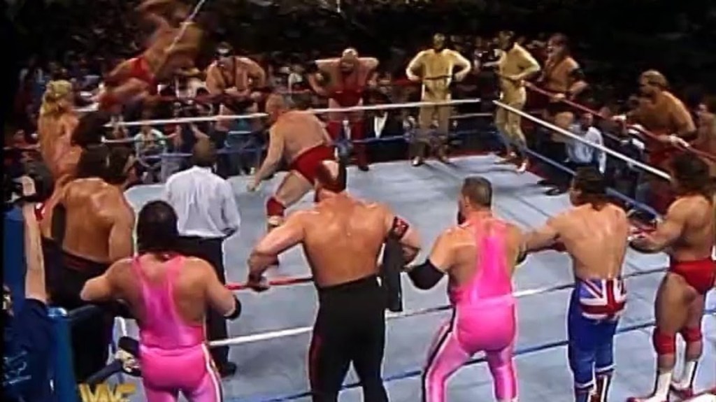 Ma c’erano tanti altri conti in sospeso in WWF: Honky Tonk Man tramava vendetta contro Ultimate Warrior, ma sapeva di non poter competere contro l’uomo che a SummerSlam lo aveva triturato in 31 secondi, mentre Brutus “The Barber” Beefcake aveva ancora un conto in sospeso con “Outlaw” Ron Bass da agosto, per non parlare di “The Rock” Don Muraco, che doveva ancora farla pagare una volta per tutte a Greg “The Hammer” Valentine per aver messo fine alla carriera del suo manager Billy Graham… tutte rivalità che furono compresse in un unico grande Survivor Series match, con Ultimate Warrior, Don Muraco, Brutus Beefcake, Sam Houston, e Blue Blazer da una parte, e Honky Tonk Man, Greg Valentine, Ron Bass, Danny Davis, e Bad News Brown dall’altra.