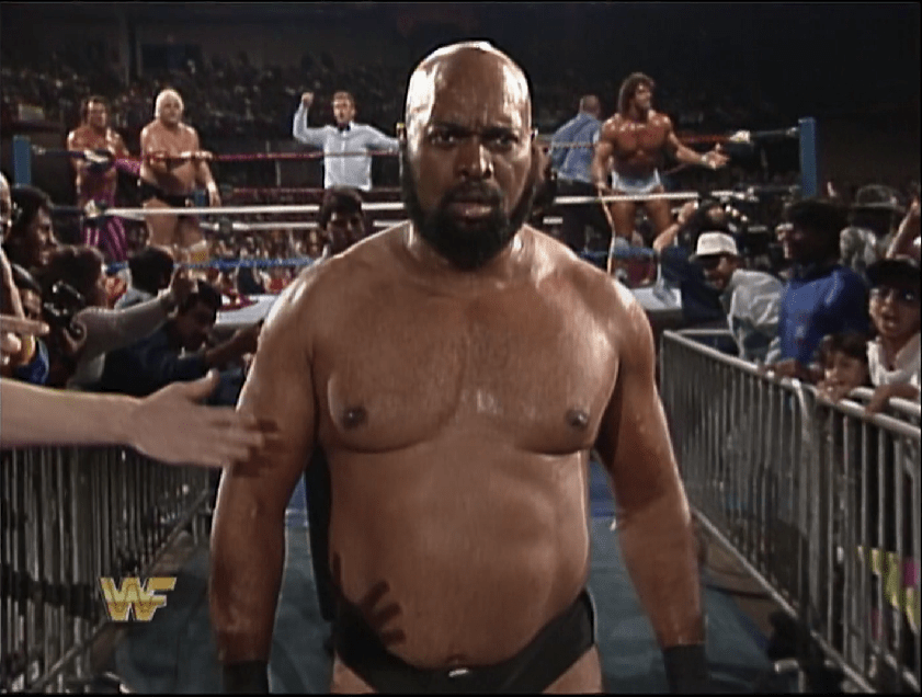 Ma anche i King’s Court avevano un arsenale da far invidia: oltre agli esperti Savage e Valentine c’era l’imbattuto Widowmaker e il forzuto Dino Bravo, che si autodefiniva “l’uomo più forte del mondo”, che per dare dimostrazione della sua immensa forza avrebbe invitato sul ring l’uomo più grosso trovato tra il pubblico, invitandolo a sedersi sopra di lui mentre faceva le flessioni! A scegliere fu il suo manager Jimmy Hart, che chiamò tra il pubblico un tale di nome John, che per stazza non aveva molto da invidiare a certi giganti della WWF, visto che stando a quanto dichiarato pesava oltre 200 kg!