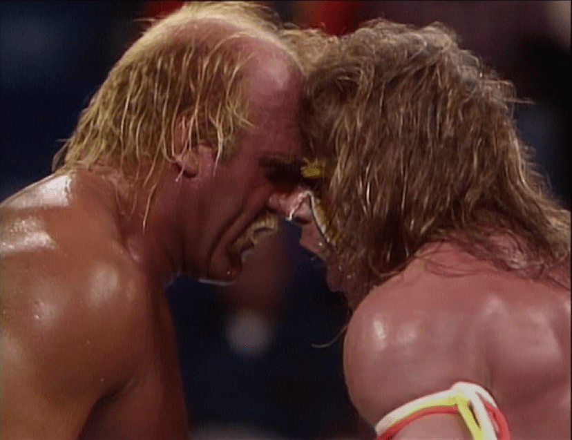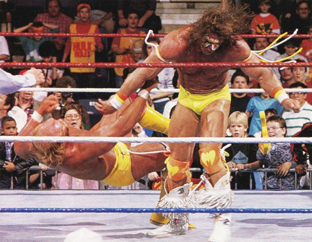 Nel ring il livello dei wrestler rimasti era altissimo: Tito Santana, Jimmy Snuka, Honky Tonk Man, Jim Neidhart, ma nessuno sembrava in grado di poter eliminare Ultimate Warrior, tranne uno, che fece poi il suo ingresso, l’altro grande favorito del match, che tutti erano ansiosi di vedere frapposto al Guerriero… il campione WWF Hulk Hogan! Con l’ingresso dell’Hulkster presto il ring si svuotò, perché lui e Ultimate Warrior iniziarono a eliminare wrestler a raffica, come per dimostrare all’altro chi era il più forte: presto caddero tutti come mosche, come vittime di un vortice, finché non rimasero solo loro due! In quel momento il battito cardiaco di tutti accelerò: Hulk Hogan e Ultimate Warrior non erano solo i più grandi beniamini dei fan, ma le forze più devastanti del mondo del wrestling, e vederli contro l’un l’altro era il sogno proibito di tutti, come assistere allo scontro tra le entità più potenti dell’universo, una battaglia tra Dei a cui i comuni mortali potevano solo assistere inermi, perché il dispiego di forza avrebbe fatto tremare le fondamente della Terra!