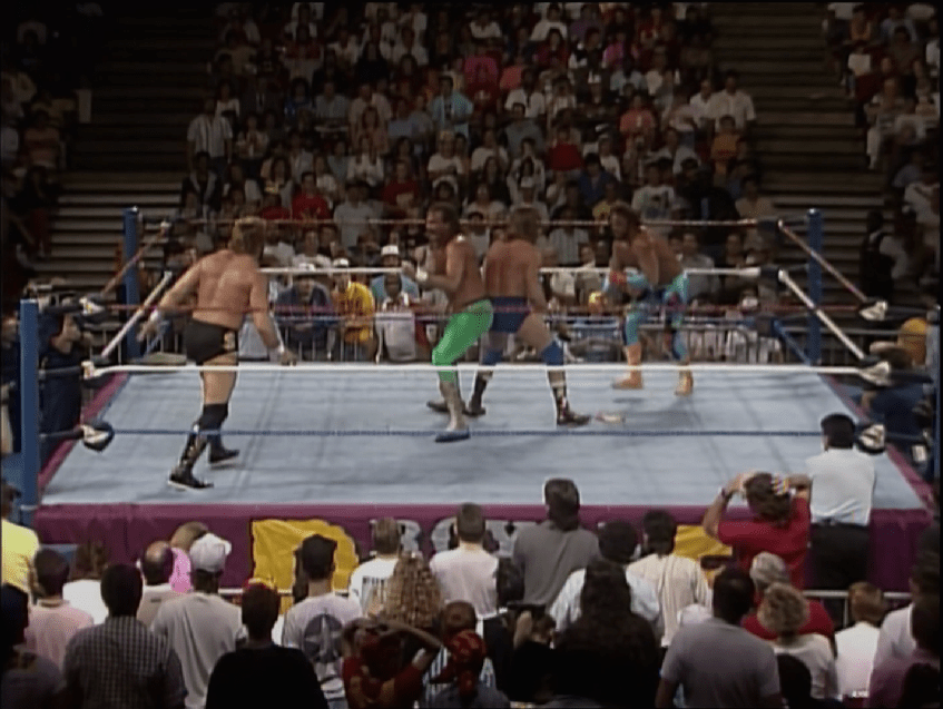 I due titani erano potenzialmente la coppia più forte nella storia non della WWF, ma dell’intera disciplina, e nonostante quanto successo a Royal Rumble collaborarono più che bene insieme, galvanizzati dal lavorare entrambi con qualcuno al proprio pari. La vittoria di Hogan & Warrior arrivò senza grandi dubbi grazie a una Leg Drop di Hogan, ma Mr. Perfect e The Genius non si arresero al verdetto arbitrale, attaccando Ultimate Warrior meglio che potevano, che però reagì con la sua consueta furia, con l’Hulkster che tentò anche di aiutarlo, ma il Guerriero, preso dalla foga e in piena trance agonistica, stese anche Hogan!