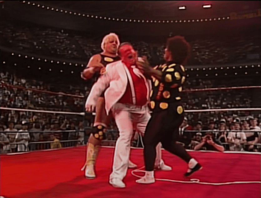Il pubblico era impossibilitato dal scegliere con chi schierarsi: amava entrambi parimenti, e alla fine entrambi ricevettero ovazioni continue. Averli così vicini era come accendere una sigaretta in una stanza piena di gas: le loro forze erano troppo equivalenti, e quando una forza ne incontra un’altra uguale e contraria, le due forze si annullano a vicenda. Il Guerriero e l’Hulkster si colpirono con tutta la loro potenza, ma nessuno prevalse, finché non arrivarono i successivi ingressi di Barbarian e “Ravishing” Rick Rude a porre fine al confronto dell’anno. Hulk Hogan sapeva che il Guerriero era l’unico con una forza paragonabile alla sua, e usò l’aiuto di Rude e Barbarian per eliminarlo, anche se rappresentava un’arma a doppio taglio: ora era praticamente senza alleati, e la situazione non fece che peggiorare, perché l’ultimo ingresso fu quello di Mr. Perfect, che aveva osato distruggere il suo titolo WWF.