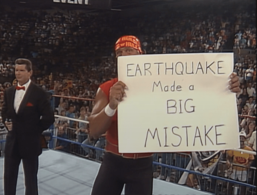 Giunto sul ring per l’intervista, Hogan dimostrò di aver superato il suo momento buio, perché senza esitare invitò Earthquake a farsi avanti! Non passò neanche un minuto che si presentarono Earthquake e Dino Bravo, un tandem che avrebbe potuto vincere qualsiasi guerra, ma anche se era da solo Hogan non sembrava affatto preoccupato: i suoi Hulkamaniacs gli avevano fatto ritrovare gli occhi della tigre, e poi riponeva fiducia illimitata in Tugboat, che infatti raggiunse l’Hulkster senza farsi pregare, costringendo Earthquake e Bravo alla fuga. La guerra tra Earthquake e Hulk Hogan era ufficialmente ripresa, ma stavolta l’Hulkster se la sarebbe giocata ad armi pari!