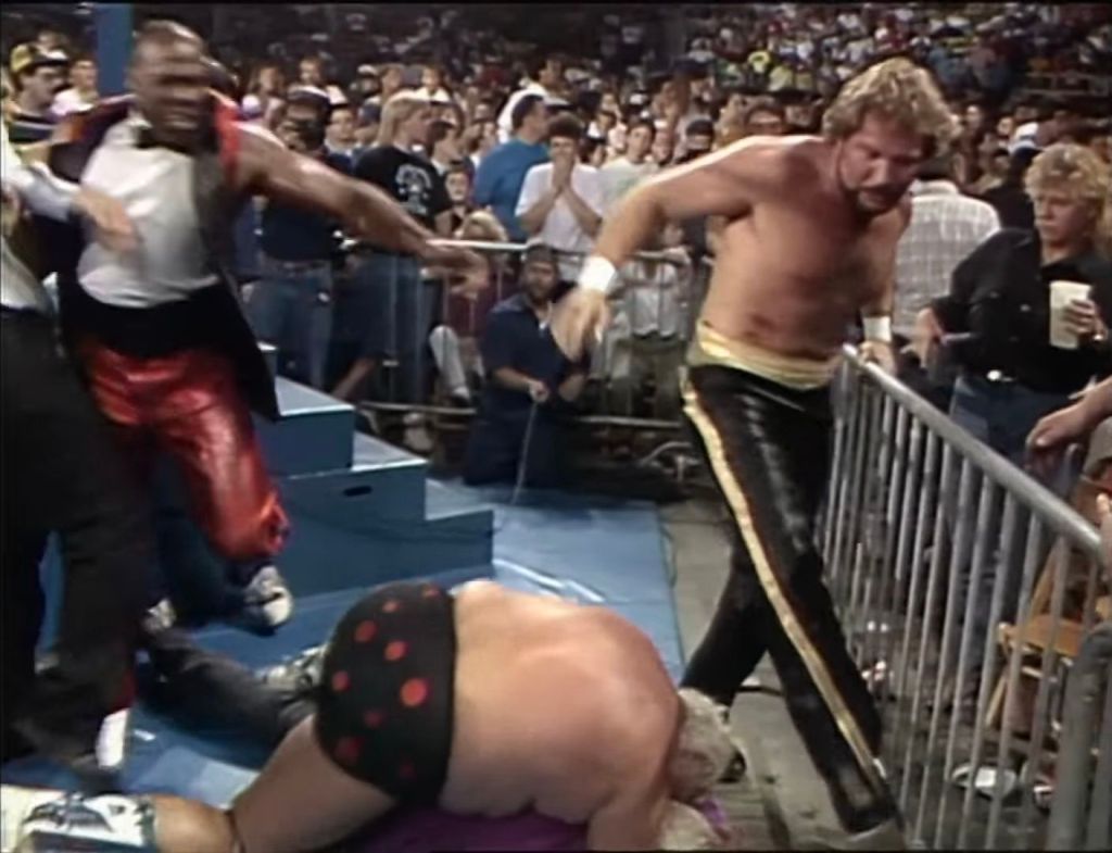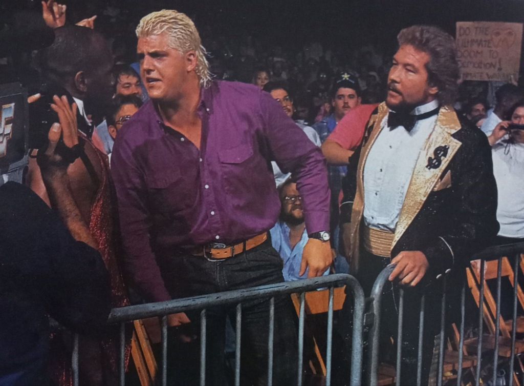 Non appena saputo di suo figlio tra il pubblico, Ted DiBiase e Virgil ne escogitarono un’altra delle loro, facendosi strada tra il pubblico e offrendo una mazzetta di soldi per comprare dagli spettatori in prima fila i loro posti, cacciandoli da lì solo per arrivare a Dustin Rhodes e offrirgli lo stesso! Ovviamente il figlio dell’American Dream non guardò neanche i soldi (anzi, li stracciò proprio!), rigettandoli in faccia a Virgil: nessuno poteva comprare il sostegno a suo padre! A quel punto DiBiase e Virgil si sedettero ai lati di Dustin, che continuò a sostenere il padre a squarciagola, finché al momento giusto non se la presero con lui!