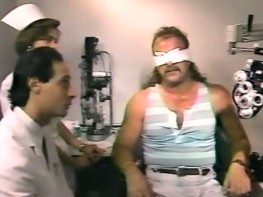 Nell’impatto della DDT a Roberts caddero i suoi occhiali, rivelando la preoccupante condizione dei suoi occhi: uno era piuttosto malandato, l’altro completamente bianco! Non fosse stata per la cecità, quegli occhi avrebbero fatto sembrare Jake Roberts persino più pericoloso e assetato di sangue che mai, ma il suo futuro era tutt’altro che certo, e dopo aver visto in che condizioni si trovava la sua vista, i fan iniziavano a temere che quella potesse essere la sua fine, per quanto agguerrito ancora fosse.