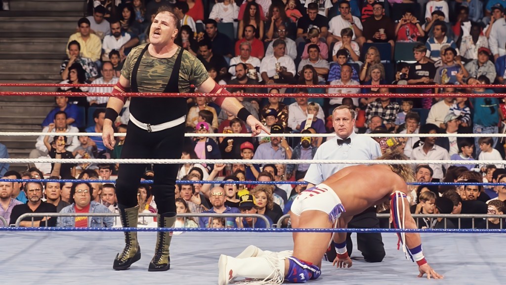 Se Sgt. Slaughter era motivato, Ultimate Warrior lo era persino di più, e appena il match iniziò strapazzò il traditore come fosse un pupazzo: lo scaraventò da un lato all’altro del ring, lo investì con tutta la forza che aveva in corpo, e gli mise persino la bandiera irachena in bocca!