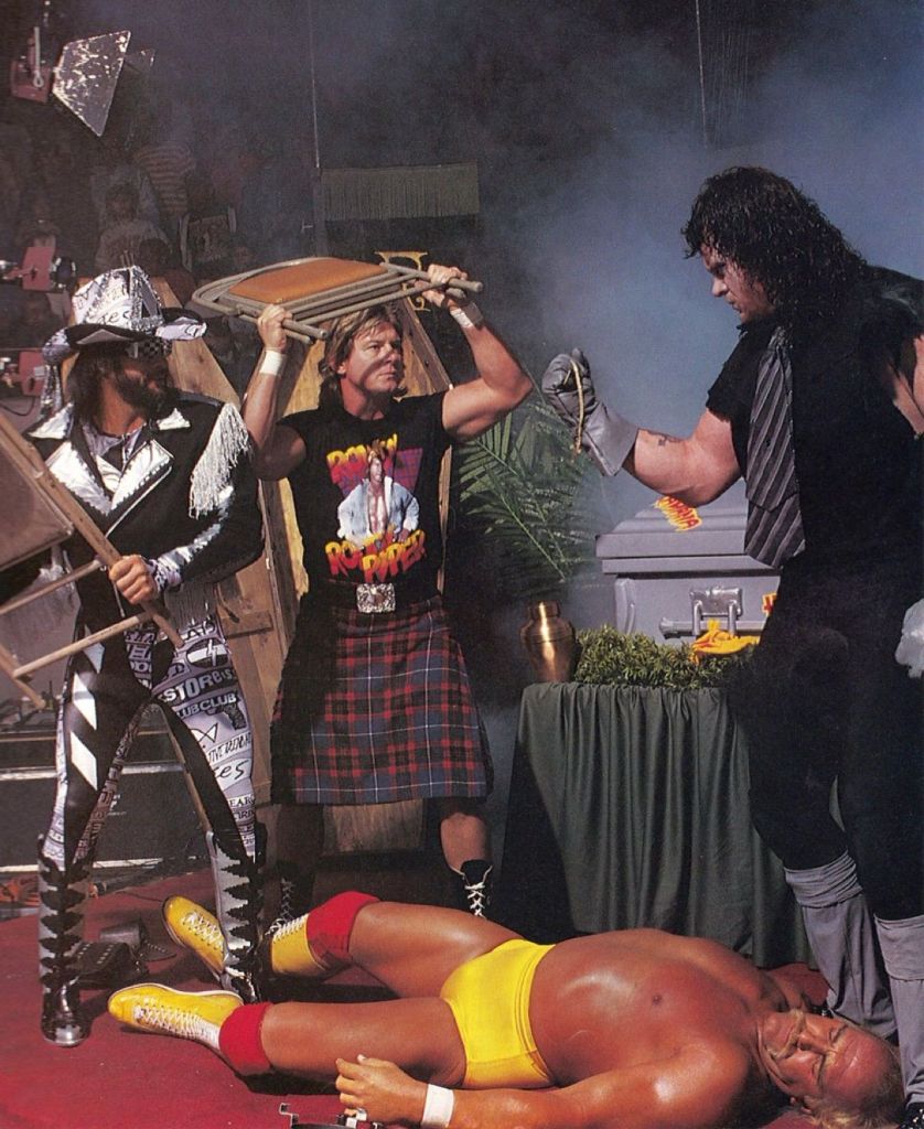 Il dado era tratto, e il Becchino attaccò subito Hogan colpendolo con la sua urna , per poi usare le sue immense mani per soffocarlo. Hogan non riusciva neanche a reagire, era come se la vita stesse lentamente abbandonando il corpo dell’Hulkster, come se per ogni suo respiro Undertaker stesse risucchiando la su anima! Per fortuna in aiuto di Hogan arrivarono “Macho Man” Randy Savage e “Rowdy” Roddy Piper, entrambi armati di sedie, non riuscendo però neanche loro a nascondere un certo timore di trovarsi di fronte al Becchino. Al contrario, Undertaker non sembrava affatto spaventato da loro, ma decise comunque di ritirarsi, senza grande fretta, consapevole di quanto neanche Piper e Savage potessero davvero danneggiarlo.