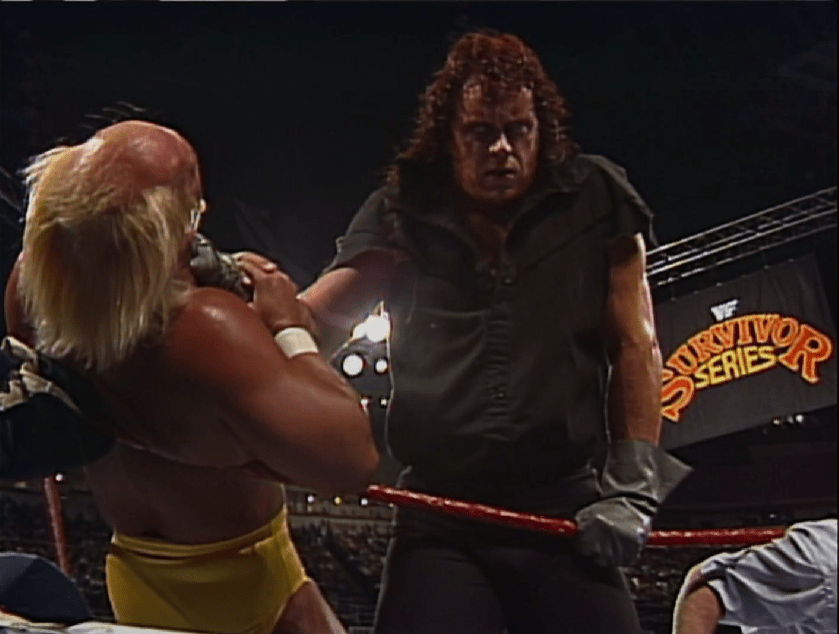 E dalla Joe Louis Arena di Detroit, Michigan, tornò quello che ormai per tutti era una tradizione di novembre tanto quanto il Ringraziamento… Survivor Series finalmente era giunto! Il primo match fu il Survivor Series match tra Ric Flair, Ted DiBiase, The Mountie, The Warlord, e il team di Roddy Piper, Bret Hart, Virgil, e British Bulldog. Era il primo match importante del “Nature Boy”, che curiosamente entrò con la vista del suo titolo NWA oscurato dalla regia: era una chiara presa di posizione in favore (ovviamente) di Hulk Hogan, riconosciuto dalla WWF come unico vero campione mondiale di wrestling.