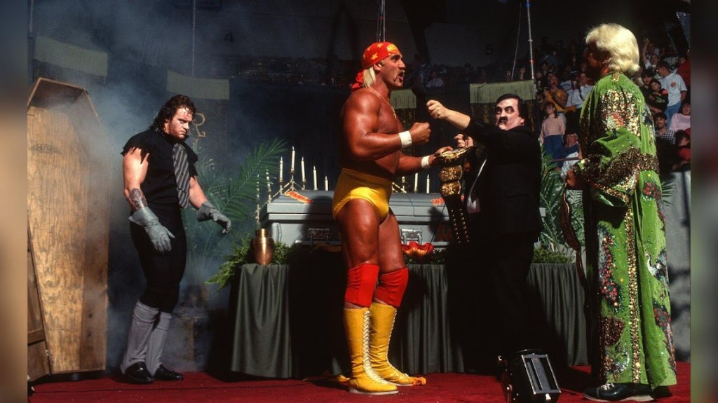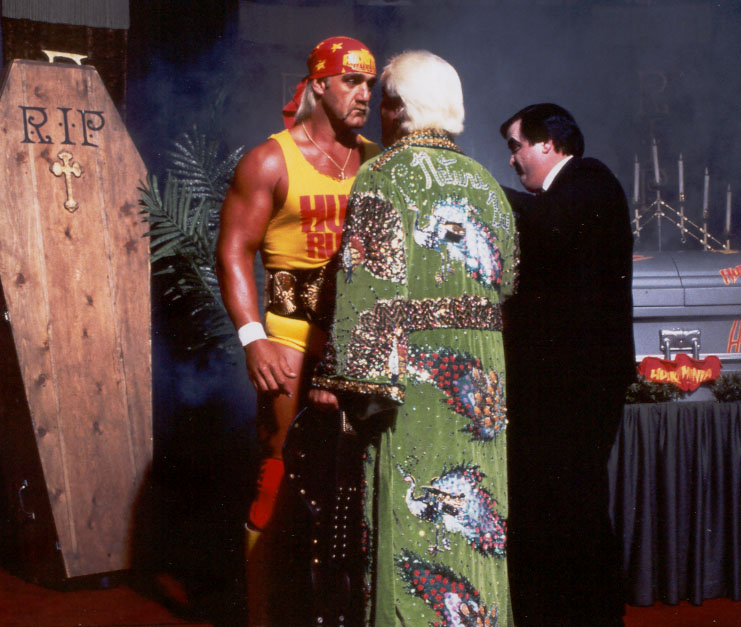 Hulk Hogan sapeva bene di cosa era capace il “Nature Boy”: la sua fama lo precedeva, ma non provava paura di fronte a lui, e anzi lo invitò a farsi sotto strappandosi la maglietta! Ma a quel punto scattò la trappola, e dalla bara del set spuntò fuori Undertaker!