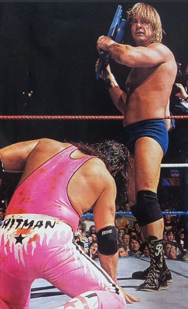 Tra i due fu Piper a mostrare più aggressività, come se volesse ostentare in tutti i modi che l’amicizia tra lui e Bret non avrebbe contato nulla fino al suono della campana. Ci furono sputi, provocazioni, e persino uno schiaffo: lo scozzese si mosse ai limiti del regolamento facendo persino sanguinare l’Hitman, che al contrario che dimostrò sempre grande lealtà. L’aggressività del campione portò Bret Hart a sanguinare copiosamente e ad apparire a un passo dal cedimento, e proprio nel momento di maggior debolezza dell’Hitman, sanguinante e in ginocchio, Piper ebbe l’opportunità di farla finita colpendo Bret con la campana presa dal tavolo del commento per finirlo una volta per tutte, approfittando dell’arbitro messo involontariamente KO.