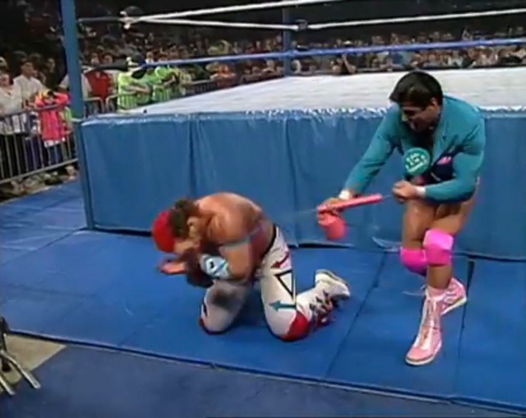 Nel frattempo Ric Flair era stato sfidato anche da Sgt. Slaughter, ma come al solito il “Nature Boy” aveva un piano già pronto: durante il match infatti arrivarono Jimmy Hart e The Mountie, che mentre Mr. Perfect distraeva l’arbitro fulminò Slaughter col suo solito taser, regalando la vittoria a Flair. Era stata una vera e propria imboscata orchestrata da Flair e Mr, Perfect, che si erano avvalsi dell’aiuto dell’infido Jimmy Hart, mostrando quanto le sue alleanze non sembrassero avere fine. Sgt. Slaughter era un duro, ma neanche lui poteva resistere a una simile scarica di volt, e fu subito portato in ospedale per accertamenti. E ora la domanda era: Flair aveva chiesto aiuto a Jimmy Hart solo per il suo match contro Slaughter, o si trattava di una nuova temibile alleanza che avrebbe sfruttato anche contro “Macho Man”?