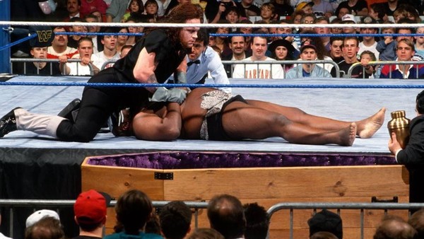 Fu poi il momento di uno degli incontro più attesi della serata: il Coffin match tra Undertaker e Kamala! L’ugandese non fu praticamente mai nel match, terrorizzato alla sola vista di Undertaker, anche se col passare dei minuti iniziò ad acquistare fiducia. Servì comunque a poco, perché il Becchino lo schienò dopo averlo messo KO con la sua urna, e ora per l’ugandese non c’era più nulla da fare: sarebbe stato internato nella bara che avevano costruito solo per lui! Paul Bearer mise il coperchio, con Undertaker che invece si occupò dei chiodi con colpi secchi e decisi: troppe anime aveva sigillato tra quelle mura di legno, e ormai per lui piantare quei freddi chiodi era la prassi, come testimoniava anche la sua freddezza nel farlo, e ora Kamala poteva… riposare in pace!