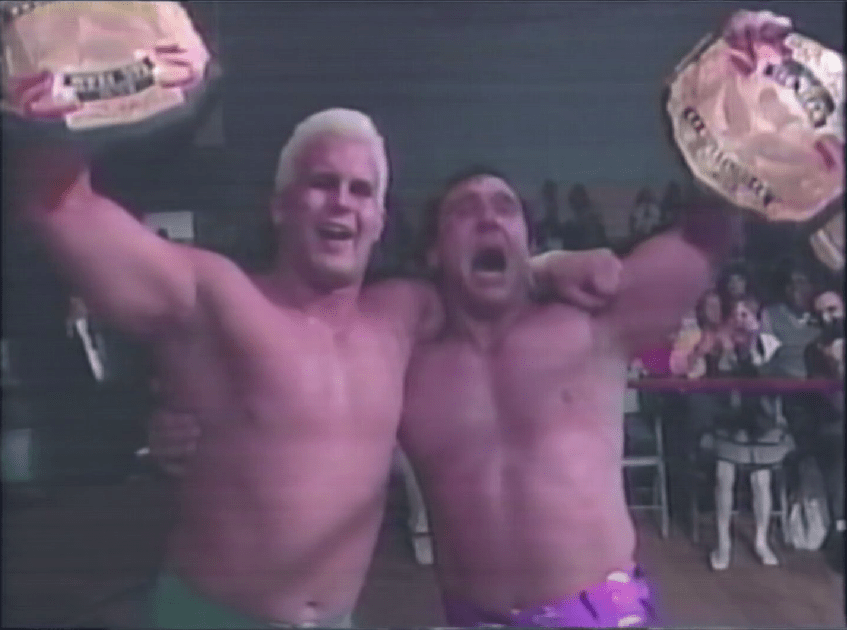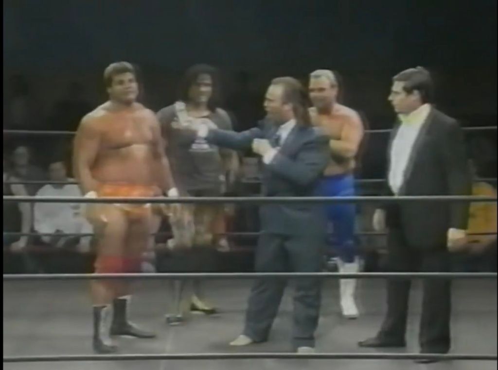 Dopo aver dominato in lungo e in largo la categoria di coppia, i Super Destroyers dovettero difendere nuovamente i titoli contro Larry Winters & Tony Stetson in una stipulazione particolare: se avessero perso, Winters & Stetson si sarebbero dovuti rasare i capelli, e stavolta per evitare nuovi finali scorretti Hunter Q. Robbins III sarebbe stato ammanettato a bordo ring! Robbins naturalmente tentò comunque di favorire i suoi, ma a tenerlo a bada fu “Ironman” Tommy Cairo, seduto accanto a lui per qualsiasi evenienza.