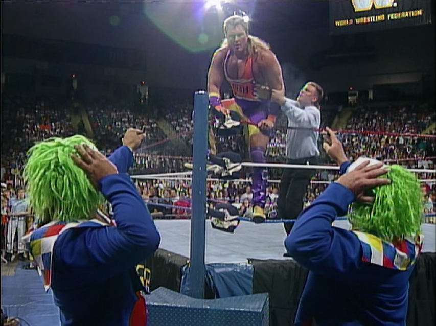 Il pagliaccio aveva infatti usufruito ancora una volta del suo trucco del doppione, creando in Crush abbastanza confusione da distrarlo e permettere a Shawn Michaels di colpire Crush alle spalle con un Superkick dietro la nuca, mantenendo così la cintura.