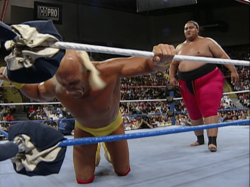 A terra, con la faccia dolorante e inerme, Hogan subì da Yokozuna la sua stessa medicina: una devastante Leg Drop di 260 kg, che gli consegnò per la seconda volta il titolo. Hulk Hogan aveva perso il titolo, e non contenti Yokozuna e Mr. Fuji infierirono su di lui con un Banzai Drop che fracassò il petto dell’Hulkster, costringendolo ad uscire barcollante, quasi in lacrime, debole e sorretto da un gruppo di arbitri, con Yokozuna a festeggiare la vittoria nel ring. Non esattamente l’immagine più immediata quando si pensa ad Hulk Hogan. WrestleMania IX aveva illuso che un Hogan con ancora stimoli potesse ancora essere l’atleta più forte del mondo, ma ormai anche questa certezza era stata spazzata via da Yokozuna, e con la sua stessa Leg Drop!