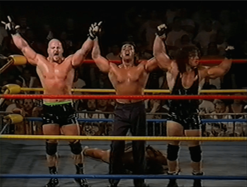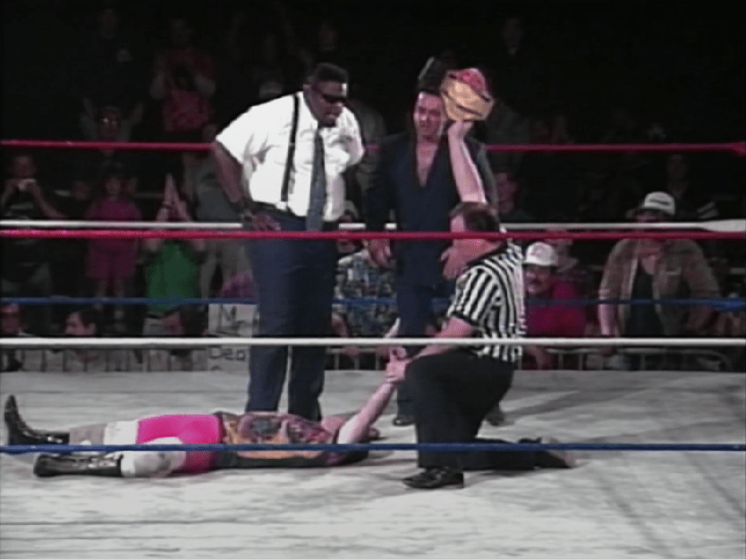 Ma per quanto Cactus Jack potesse incassare, neanche lui poteva sdoppiarsi per tenere testa agli interventi di 911 e Paul E. Dangerously, che gli spaccò il suo cellulare in testa, permettendo a Sabu di schienarlo e proclamarsi il solo e assoluto Re dell’hardcore. Anche al suono della campana però il caos regnò sovrano, con Sabu e Cactus Jack che non accennarono a fermarsi, e in aiuto di Sabu arrivarono 911 e persino Mr. Hughes, che però fu sorprendentemente fermato da “The Franchise” Shane Douglas. Nessuno sembrava capire perché il campione ECW si fosse messo di mezzo (ma realisticamente era perché tra Douglas e la Dangerous Alliance non correva buon sangue), ma il suo intervento servì comunque a poco, perché il gruppo capitanato da Paul E. alla fine ebbe la meglio.