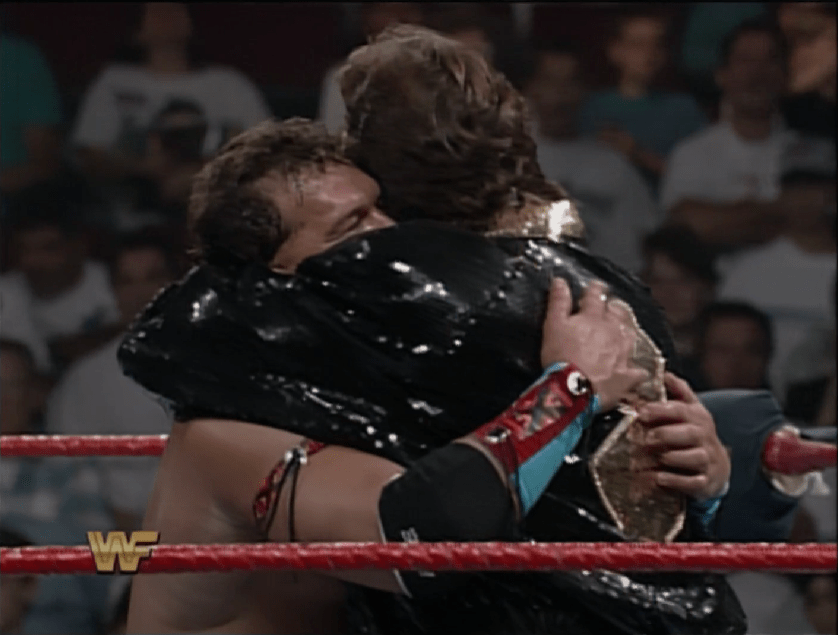 I tentativi di uscire dalla gabbia furono tantissimi da parte di entrambi, e proprio uno di questi fu fatale per Owen che rimase incastrato con una gamba nella cella, permettendo a Bret di toccare il suolo per primo e confermarsi campione WWF dopo mezz’ora di incessante battaglia. Adesso Owen e Bret erano sull’1-1, con quest’ultimo che poteva (forse) prendersi una pausa dalla guerra fratricida col fratello, chiudendo quello che senza dubbio era stato lo Steel Cage match più bello della storia della WWF. Ma le celebrazioni dell’Hitman di fatto non ci furono, perché Jim Neidhart scavalcò le transenne per fargliela pagare, riportandolo nel ring insieme a Owen e chiudendo la gabbia con un catenaccio cosicché nessuno potesse intervenire. Tutta la famiglia Hart accorse per salvare Bret, mentre Neidhart lo pestava e Owen impediva alla sua famiglia di entrare, finché il loro numero non si fece valere costringendo i due alla fuga. Bret era ancora campione WWF, ma Owen non sembrava ancora intenzionato a farsi da parte…