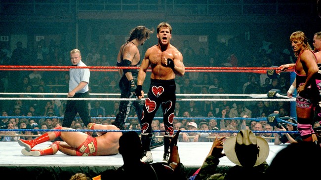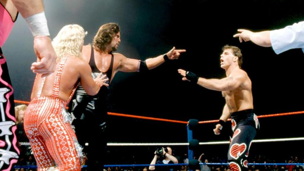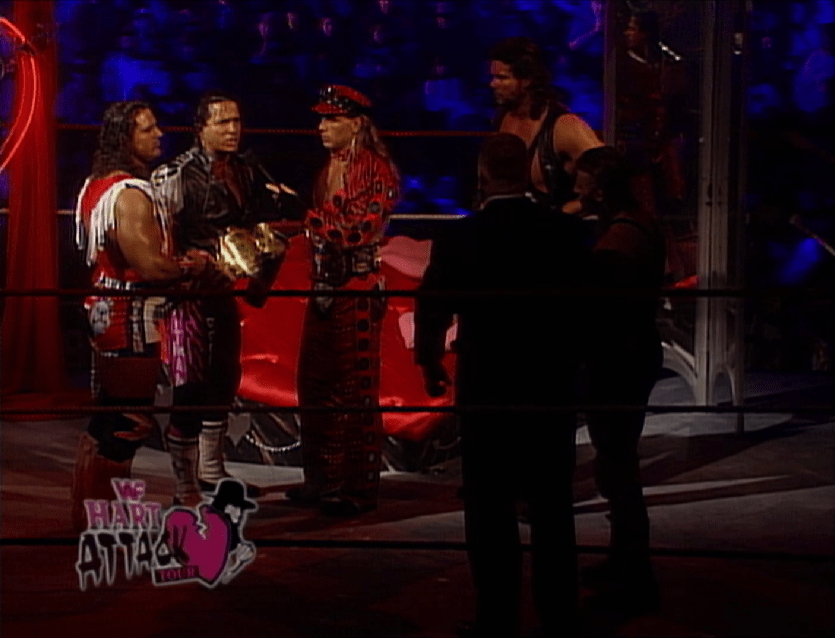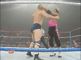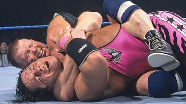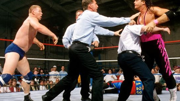 In quel momento l’espressione di Owe cambiò, come se avesse appena realizzato cosa aveva fatto: aveva causato una commozione cerebrale al cognato e lasciato il fratello in balia di una delle mosse più dolorose e inviolabili che ci fossero, e come se non bastasse, a bordo ring i suoi genitori erano col fiato sospeso, in particolare la madre. Lo sguardo del dolore dilaniante che Bret stava provando colpì persino Owen, che per la prima volta da quando aveva dato il via alla sua guerra fratricida sembrò provare serio pentimento. Era come se l’immagine di Bret in trappola avesse spazzato via tutta la gelosia e l’invidia che Owen aveva covato, per fare finalmente spazio all’amore fraterno che ancora si nascondeva nel suo inconscio, e che per anni li aveva resi legatissimi, ma nessuno poteva compiere alcun atto di pietà, perché British Bulldog era ancora a terra… a meno che non lo facesse qualcun’altro!