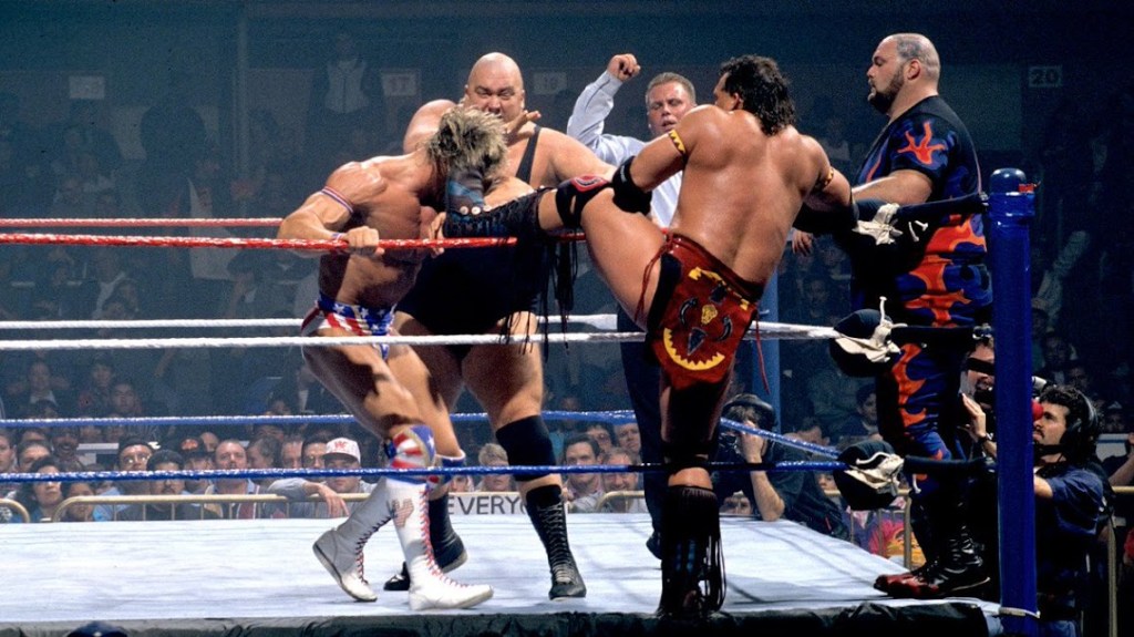 Dal Freeman Coliseum di San Antonio, Texas, iniziò l’attesa serata di Survivor Series. Il primo match fu tra i Teamsters e i Bad Guys, un incontro che si prospettava imprevedibile e scoppiettante, in cui Shawn Michaels si prese l’incarico di tattico del suo team dispensando consigli, soprattutto a Diesel, senza praticamente mai entrare in azione. Ma per quanto l’Heartbreak Kid potesse prendersi ogni merito fu proprio il suo partner il vero mattatore del match, perché dopo una dozzina di minuti con 3 Jacknife Powerbomb eliminò sia 1-2-3 che gli Headshrinkers… e tutti nell’arco 73 secondi! Fu solo allora, quando grazie a Diesel i Teamster erano in vantaggio in 5 contro 1 (ossia il capitano Razor Ramon, visto che British Bulldog era stato eliminato invece per count out), che Michaels entrò nel match, così da avere tutta la scena per sé con il minimo sforzo.