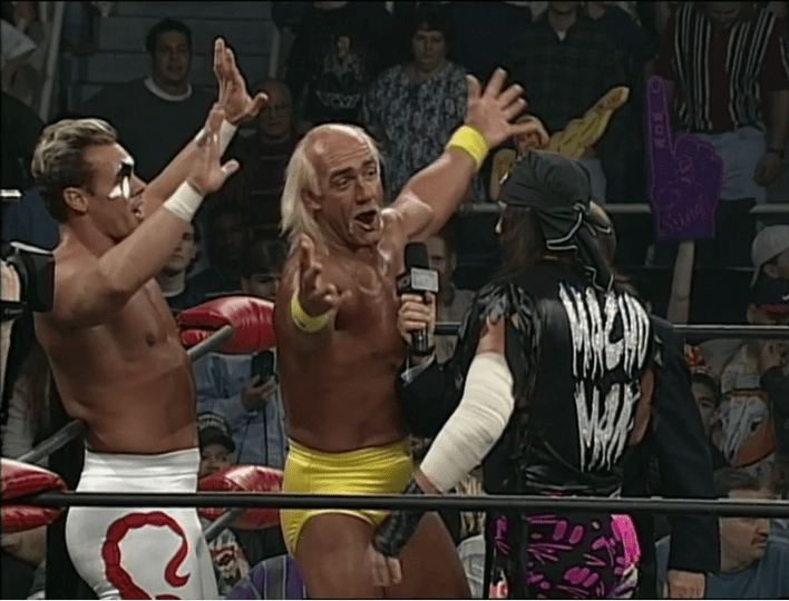 Le cose però andarono diversamente, perché Randy Savage mantenne il titolo per squalifica dopo un caotico finale che vide Hulk Hogan arginare l’intervento di Ric Flair e Jimmy Hart a favore di Lex Luger, difeso a sua volta da Sting… che fu colpito per sbaglio dall’Hulkster! Dopo aver visto sfiorare lo scontro tra i due, Savage riuscì a placare sia Hogan che Sting, che si chiarirono dopo l’ennesimo fraintendimento, con Sting che per il bene di tutti promise di tenere Luger lontano dagli affari di entrambi. Se tra Hulk Hogan e Sting le acque sembravano essersi calmate, con “Macho Man” peggiorarono la settimana successiva, quando Savage intervenì dopo un Tag Team match tra i due e Ric Flair & Arn Anderson, rimediando… un pungo volontario da Sting! Stavolta fu Hogan a fare da paciere, giustificando il gesto di Sting come causa di un eccessivo agonismo dettato dal caos della situazione (nel match intervennero infatti anche Brian Pillman e Lex Luger, che salvò soltanto Sting dall’attacco dei Four Horsemen, lasciando Hogan solo a subire).